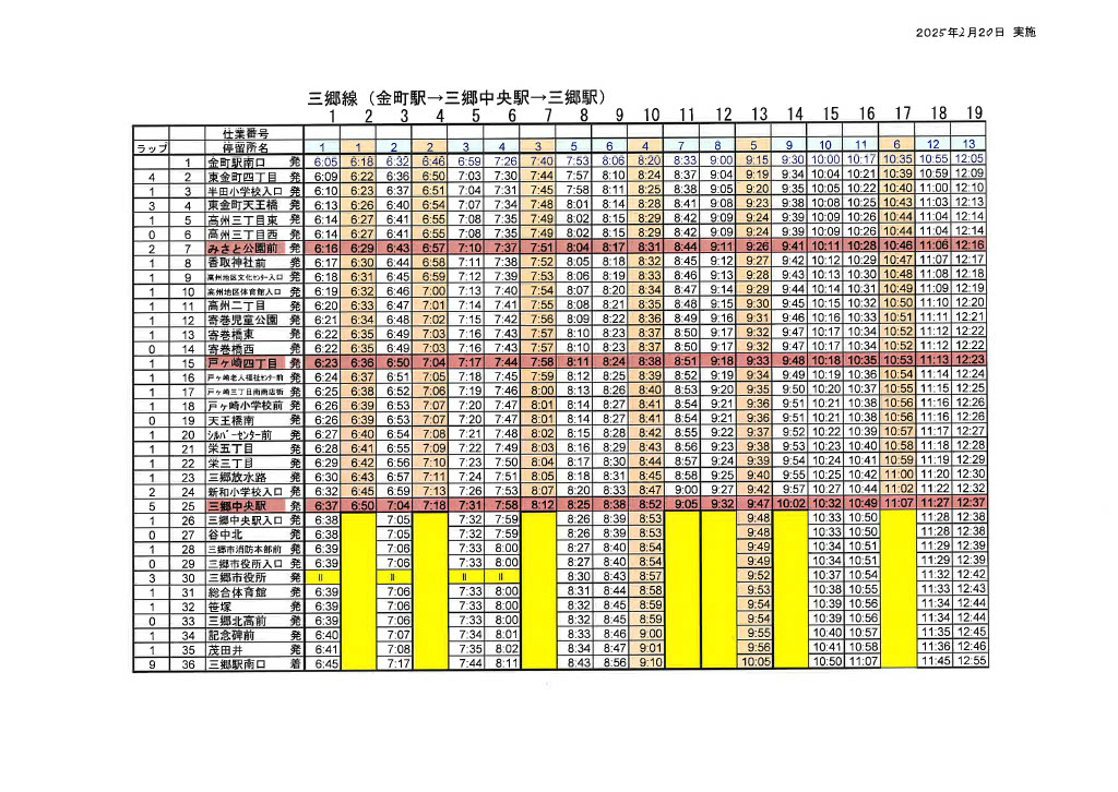 2025/02/17 日頃よりマイスカイ交通をご利用いただきましてありがとうございます。 2025年2月20日より金町線・ピアラシティ線の運行回数の変更を致します。 皆様にはご迷惑をお掛け致しますがご理解、ご協力をお願い申し上げます。 金町線(平日) 金町線(土日祝) ピアラシティ循環(平日) ピアラシティ循環(土日祝)