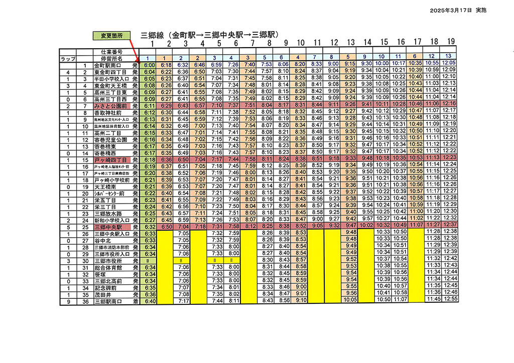 2025/03/18 日頃よりマイスカイ交通をご利用いただきまして誠にありがとうございます。 金町駅南口~三郷駅南口の停留所にお知らせを掲示いたしましたが、 2025年3月17日(月)より金町駅南口平日始発バスの時刻変更を実施 いたしました。 始発一本のみ各停留所5分出発が早くなっております。 よろしくお願い致します。